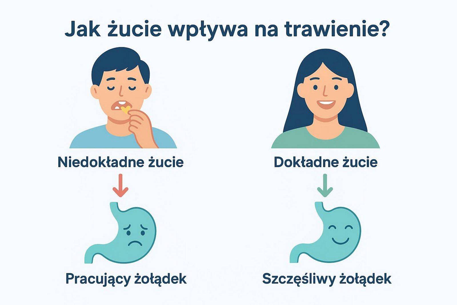 Jama ustna to pierwszy odcinek układu pokarmowego. Dokładne żucie i rozdrabnianie pokarmu ma duże znaczenie dla dalszego trawienia. Przy wadach zgryzu jedzenie nie jest wystarczająco dobrze rozdrobnione, przez co żołądek i jelita muszą pracować intensywniej. Może to sprzyjać problemom trawiennym, wzdęciom i gorszemu wchłanianiu składników odżywczych.